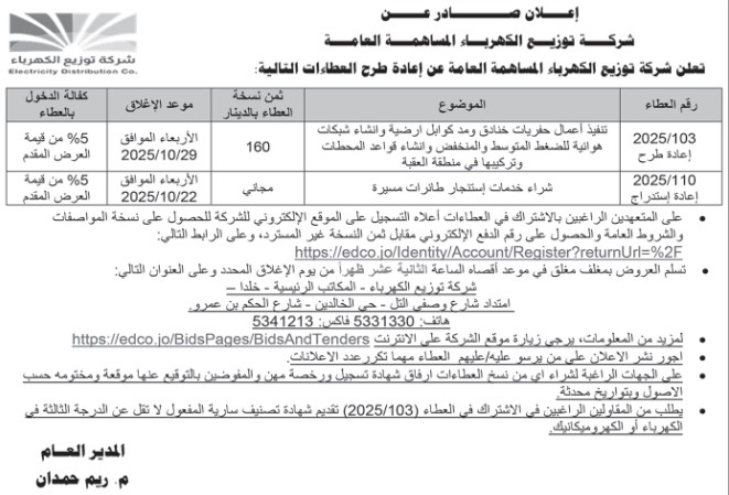 عطاءات صادرة عن شركة توزيع الكهرباء