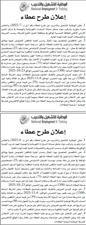 عطاءات صادرة عن الوطنية للتشغيل والتدريب