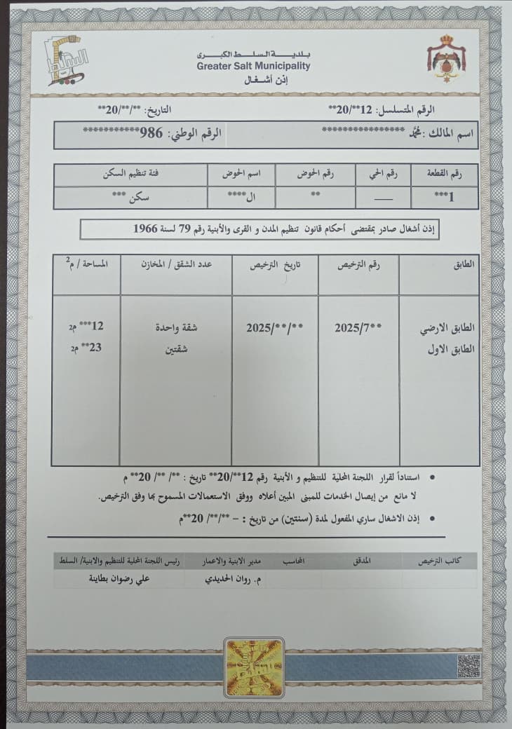 عمون - من زيد عواملة - في خطوة ريادية غير مسبوقة على مستوى بلديات المملكة أعلنت بلدية السلط الكبرى عن إطلاقها الجديد لإصدار وثائق رسمية أمنية عالية الجودة تتصدرها وثيقة "إذن الأشغال" وذلك بهدف حماية الوثائق الرسمية وحقوق المواطنين.