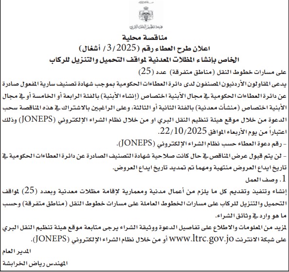 عطاء انشاء مظلات معدنية لمواقف التحميل والتنزيل للركاب