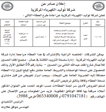 عطاء صادر عن شركة توليد الكهرباء المركزية