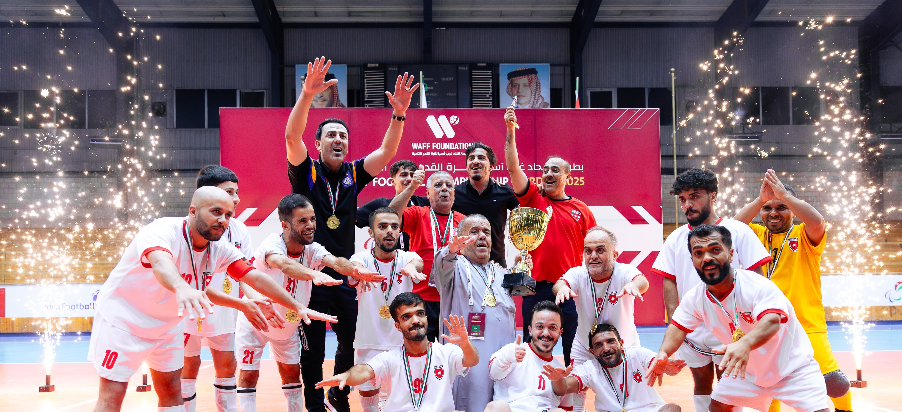 عمون - توج رئيس اللجنة البارالمبية الأردنية الأستاذ الدكتور عمر هنداوي المنتخبات أصحاب المراكز الأولى في بطولة اتحاد غرب آسيا لكرة القدم لقصار القامة، في أجواء احتفالية كبيرة شهدتها صالة قصر الرياضة بمدينة الحسين للشباب، وسط حضور جماهيري غفير عكس روح الفخر والإنجاز باللقب التاريخي للأردن.