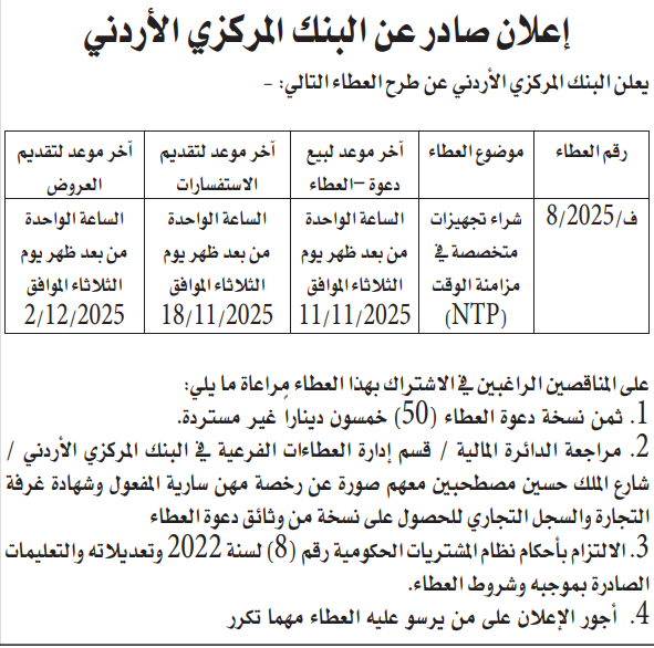 عطاء صادر عن البنك المركزي الاردني