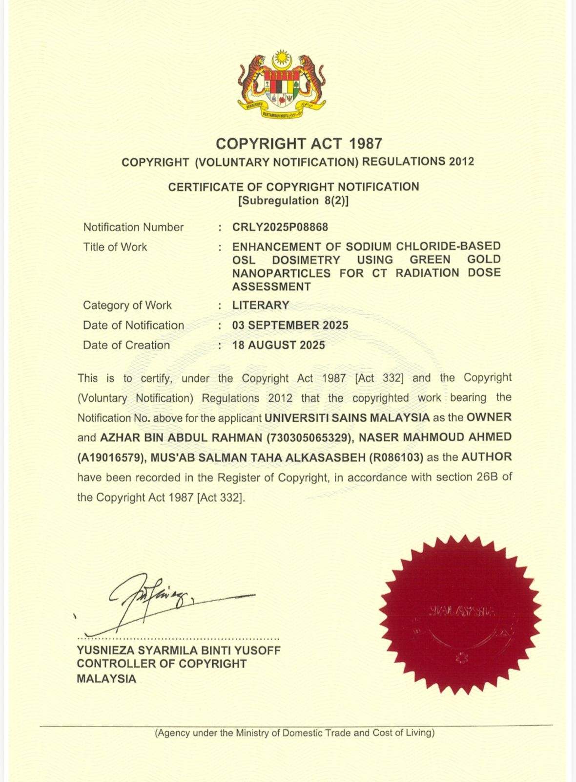 عمون - في إنجاز علمي يُضاف إلى سجل الكفاءات الأردنية والعربية في مجال العلوم الطبية التطبيقية، منحت هيئة الملكية الفكرية الماليزية (MyIPO) رسميًا براءة اختراع للدكتور مصعب سلمان الكساسبة، تقديرًا لابتكاره في تطوير مواد إشعاعية نانوية مبتكرة تُستخدم في قياس الجرعات الإشعاعية أثناء التصوير المقطعي المحوسب (CT Scan) باستخدام تقنية اللمعان المحفّز ضوئيًا (Optically Stimulated Luminescence - OSL).