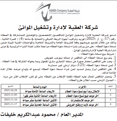 عطاء صادر عن شركة العقبة لادارة وتشغيل الموانئ