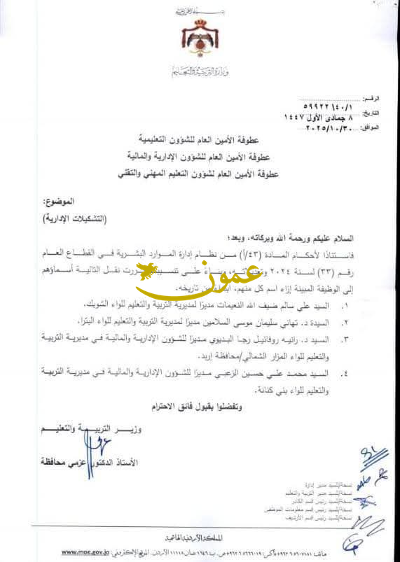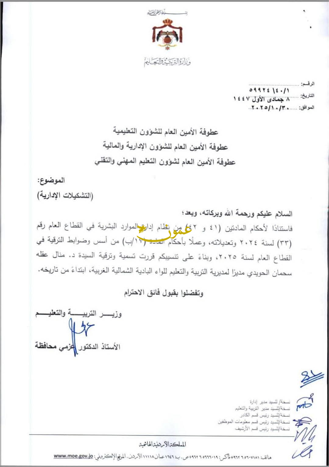 عمون -ينال المعاني- قرر وزير التربية والتعليم الدكتور عزمي محافظة إجراء تشكيلات إدارية بين كبار الموظفين.