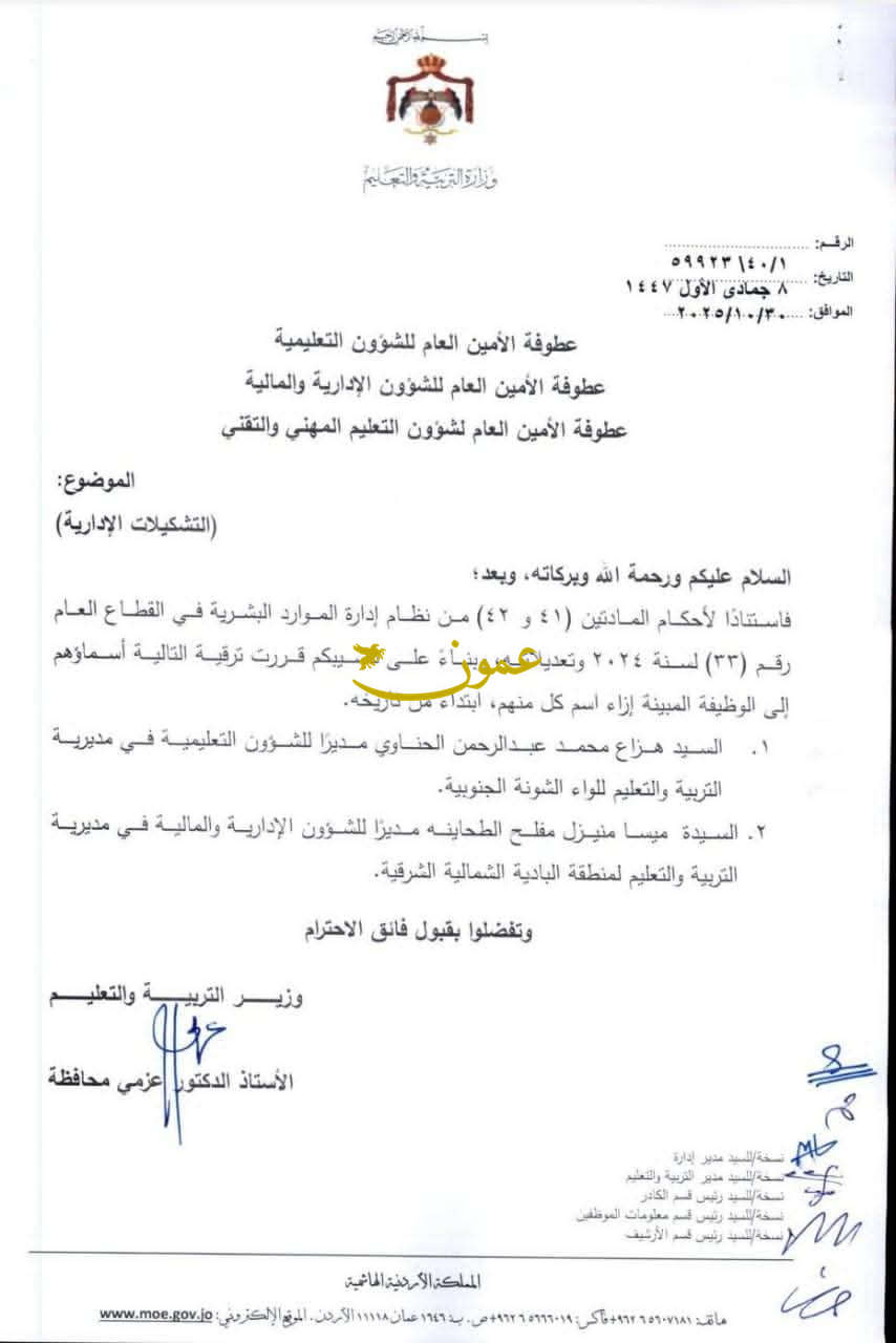 وشملت التشكيلات تعيين مدراء تربية ومدراء للشؤون الادارية والمالية.