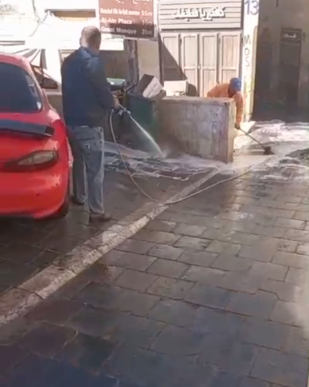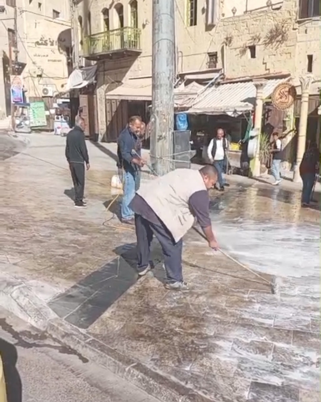 بأعمال تنظيف وشطف شاملة في وسط المدينة التراثي خصوصا في شارع الخضر وساحة العين.