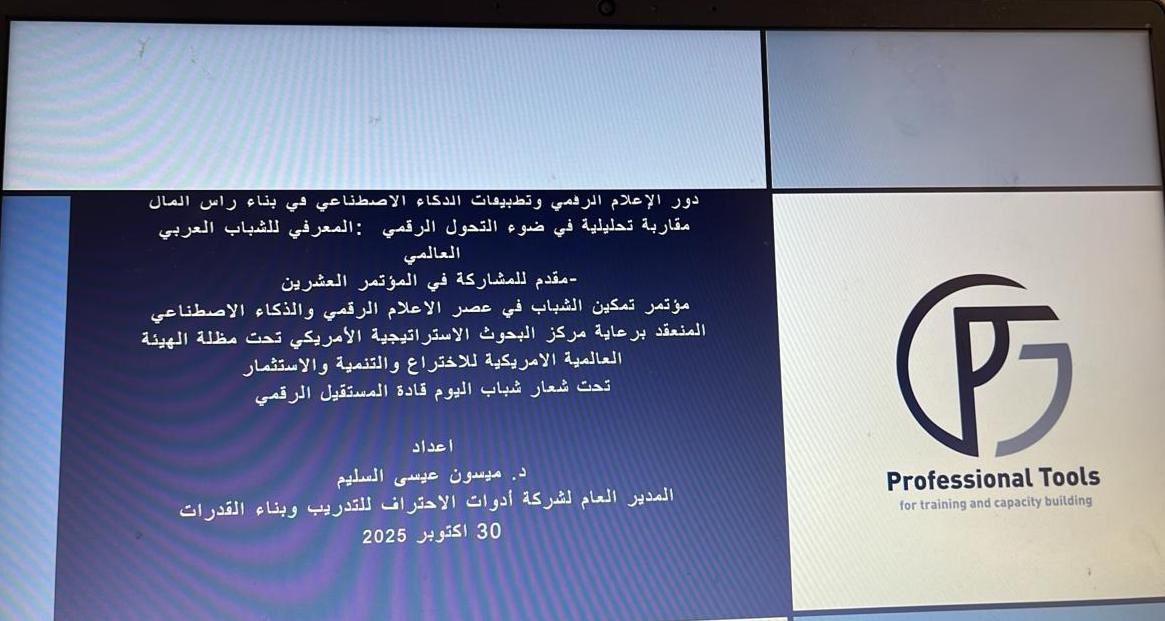 وقدّمت الدكتورة ميسون تليلان مشاركة بحثية بعنوان: "دور الإعلام الرقمي والذكاء الاصطناعي في تعزيز رأس المال المعرفي لدى الشباب العربي"، عالجت فيها مشكلة الفجوة بين الاستخدام الترفيهي للتكنولوجيا والاستخدام المعرفي البنّاء، مؤكدة أهمية توظيف الذكاء الاصطناعي والمنصات الرقمية في تنمية التفكير النقدي وصناعة المعرفة بين الشباب. واستندت الدراسة إلى مجتمع شبابي عربي وعينة مختارة من الخبراء باستخدام أدوات بحثية تضمنت استبانة علمية ومقابلات تحليلية. وكشفت النتائج عن علاقة إيجابية بين التمكين الرقمي وارتفاع القدرة المعرفية لدى الشباب، مقابل قصور في توظيف التقنية في التعلم والإبداع، لتوصي الدراسة بدمج مهارات الإعلام والذكاء الاصطناعي في التعليم، وتعزيز المحتوى العربي المتخصص، ودعم المنصات التي تُحفّز الإبداع وصناعة المعرفة.