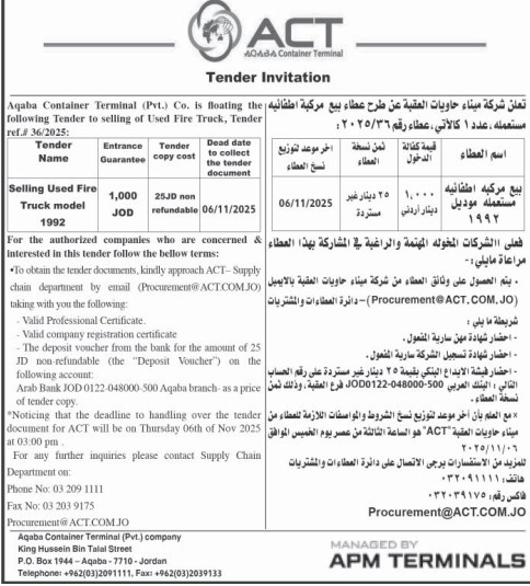 عطاء صادر عن شركة ميناء حاويات العقبة