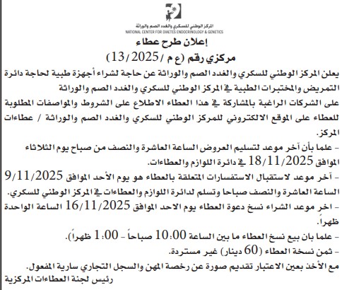 عطاء صادر عن المركز الوطني للسكري