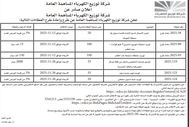 عطاءات صادرة عن شركة توزيع الكهرباء