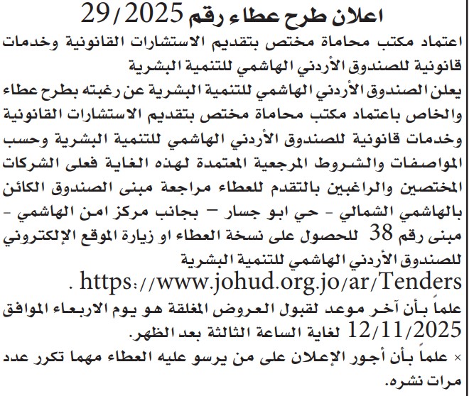 عطاء التعاقد مع مكتب محاماة لتقديم الاستشارات القانونية لصندوق الاردني الهاشمي