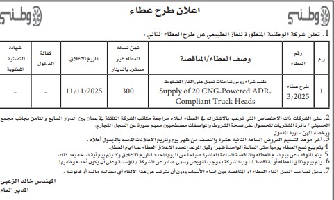 عطاء صادر عن شركة الوطنية المتطورة للغاز الطبيعي