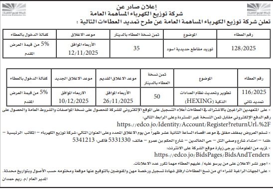 عطاءات صادرة عن شركة توزيع الكهرباء