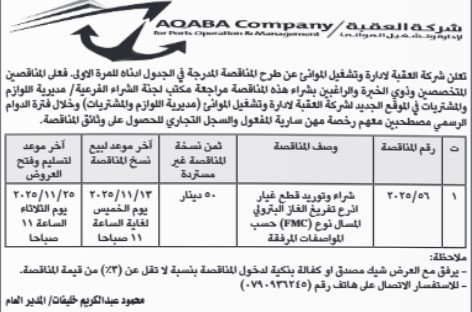 عطاء صادر عن شركة العقبة لادارة وتشغيل الموانئ