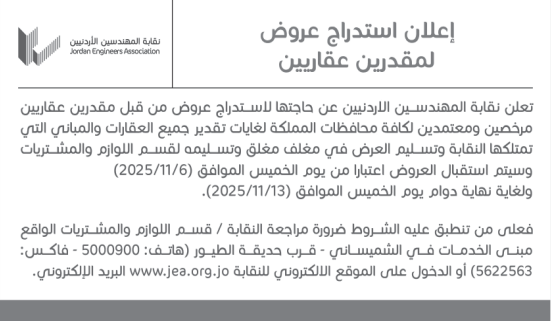 عطاء صادر عن نقابة المهندسين الاردنيين