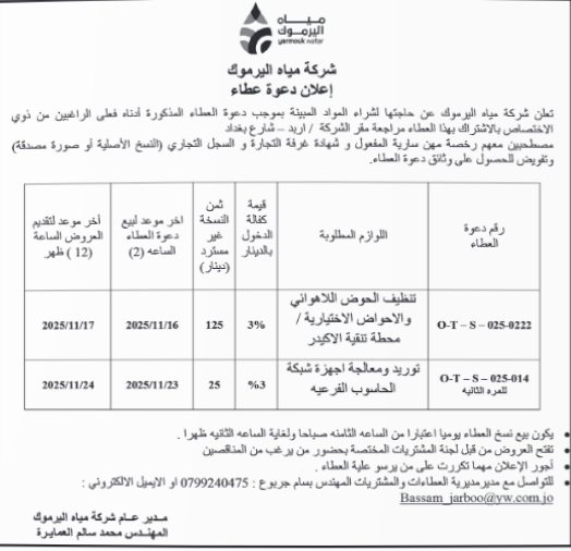 عطاء صادر عن شركة مياه اليرموك