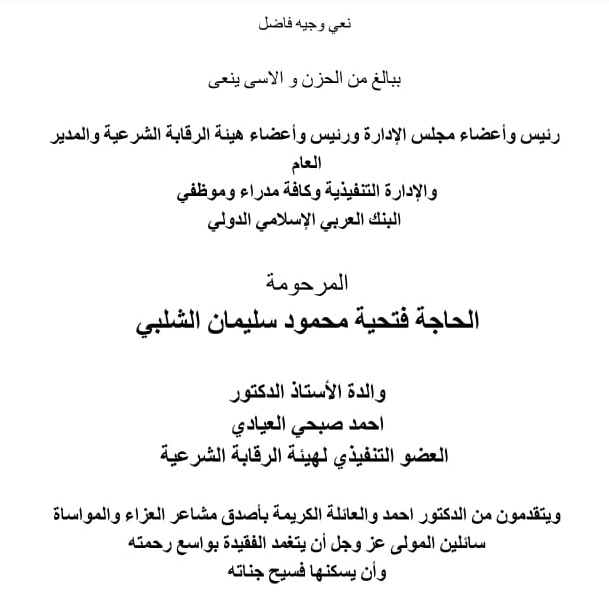 عمون - ببالغ من الحزن والاسى ينعى رئيس وأعضاء مجلس الإدارة ورئيس وأعضاء هيئة الرقابة الشرعية والمدير العام والإدارة التنفيذية وكافة مدراء وموظفي البنك العربي الإسلامي الدولي |