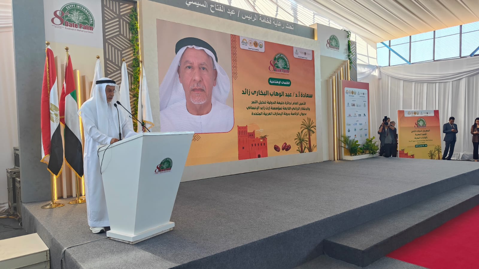 كما أشار الأستاذ الدكتور عبد الوهاب البخاري زائد أمين عام جائزة خليفة الدولية لنخيل التمر والابتكار الزراعي، التابعة لمؤسسة إرث زايد الإنساني بديوان الرئاسة بدولة الإمارات العربية المتحدة، في كلمة الافتتاح على أن تنظيم هذا المهرجان يأتي بدعم ديوان الرئاسة، بدولة الامارات العربية المتحدة، ومتابعة الشيخ نهيان مبارك آل نهيان، وزير التسامح والتعايش، رئيس مجلس أمناء جائزة خليفة الدولية لنخيل التمر والابتكار الزراعي، وإشراف سمو الشيخ ذياب بن محمد بن زايد آل نهيان، نائب رئيس ديوان الرئاسة للشؤون التنموية وأسر الشهداء، رئيس مجلس أمناء مؤسسة إرث زايد الإنساني، إلى أن هذه الرحلة الخاصة بالمهرجان الدولي للتمور المصرية بدأت منذ عام 2015 من سيوة إلى أسوان، وها نحن اليوم نواصل هذا المسار في الواحات البحرية حيث أن المهرجان الدولي للتمور المصرية اصبح منصةً عملية لتمكين المُزارع والمُصنِّع والمُصدِّر للتمور المصرية، ومساحةً لتسريع نقل المعرفة والتقنية وتحسين الجودة، وجسرًا إلى الأسواق الدولية.