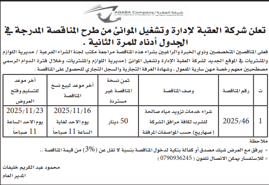 عطاء صادر عن شركة العقبة لادارة وتشغيل الموانئ