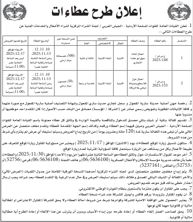 عطاءات صادرة عن القيادة العامة للقوات المسلحة