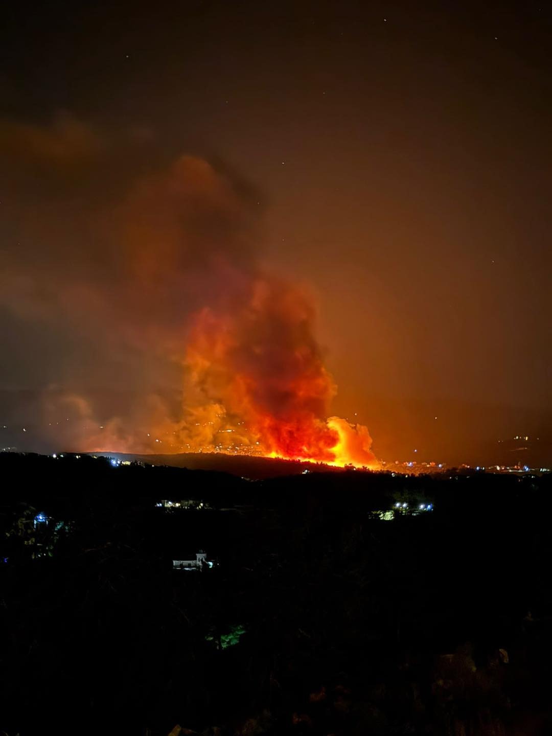 وفي جنوب لبنان، خرجت النيران عن السيطر عقب الغارة التي شنها الطيران الحربي الاسرائيلي بين الجرمق والمحمودية وخلية خازم في جبل الريحان.