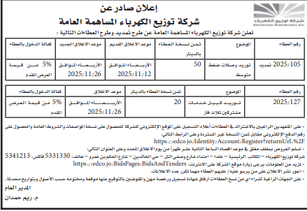 عطاءات صادرة عن شركة توزيع الكهرباء