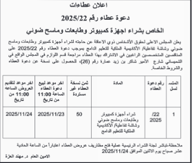 عطاء شراء اجهزة حاسوب وطابعات وماسح ضوئي