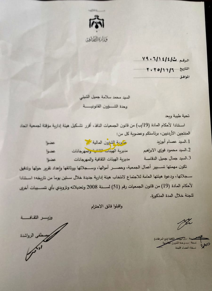 عمون - قرر وزير الثقافة مصطفى الرواشدة تشكيل هيئة إدارية مؤقتة لجمعية اتحاد المنتجين الأردنيين برئاسة محمد سلامة جميل الشبلي. |
