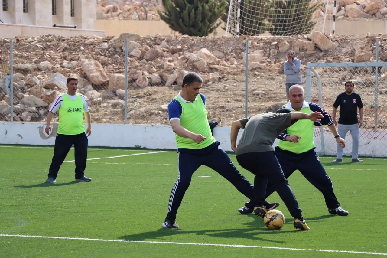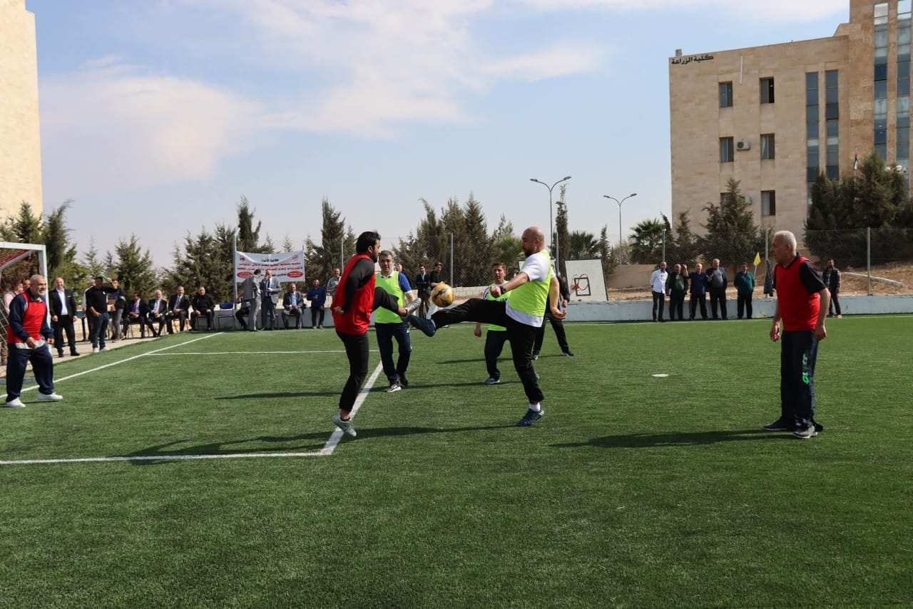 عمون - نظّمت عمادة شؤون الطلبة في جامعة عجلون الوطنية مباراةً ودّية في أجواء يسودها الحماس والروح الرياضية، جمعت بين أعضاء الهيئتين التدريسية والإدارية في الجامعة، بمشاركة رئيس الجامعة الأستاذ الدكتور فراس الهناندة، وعددٍ من العمداء وأعضاء الهيئتين التدريسية والإدارية من مختلف الكليات والدوائر. |