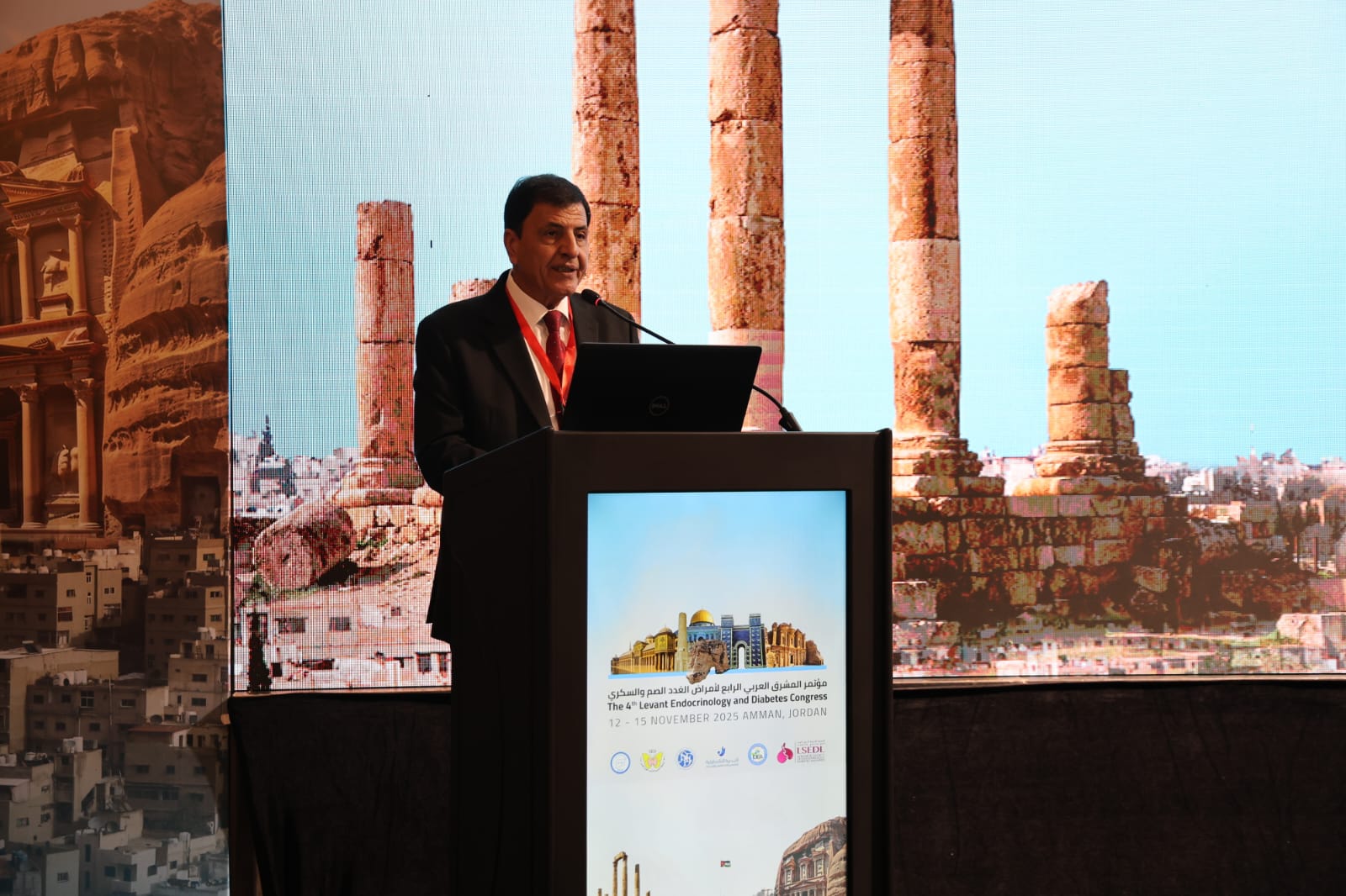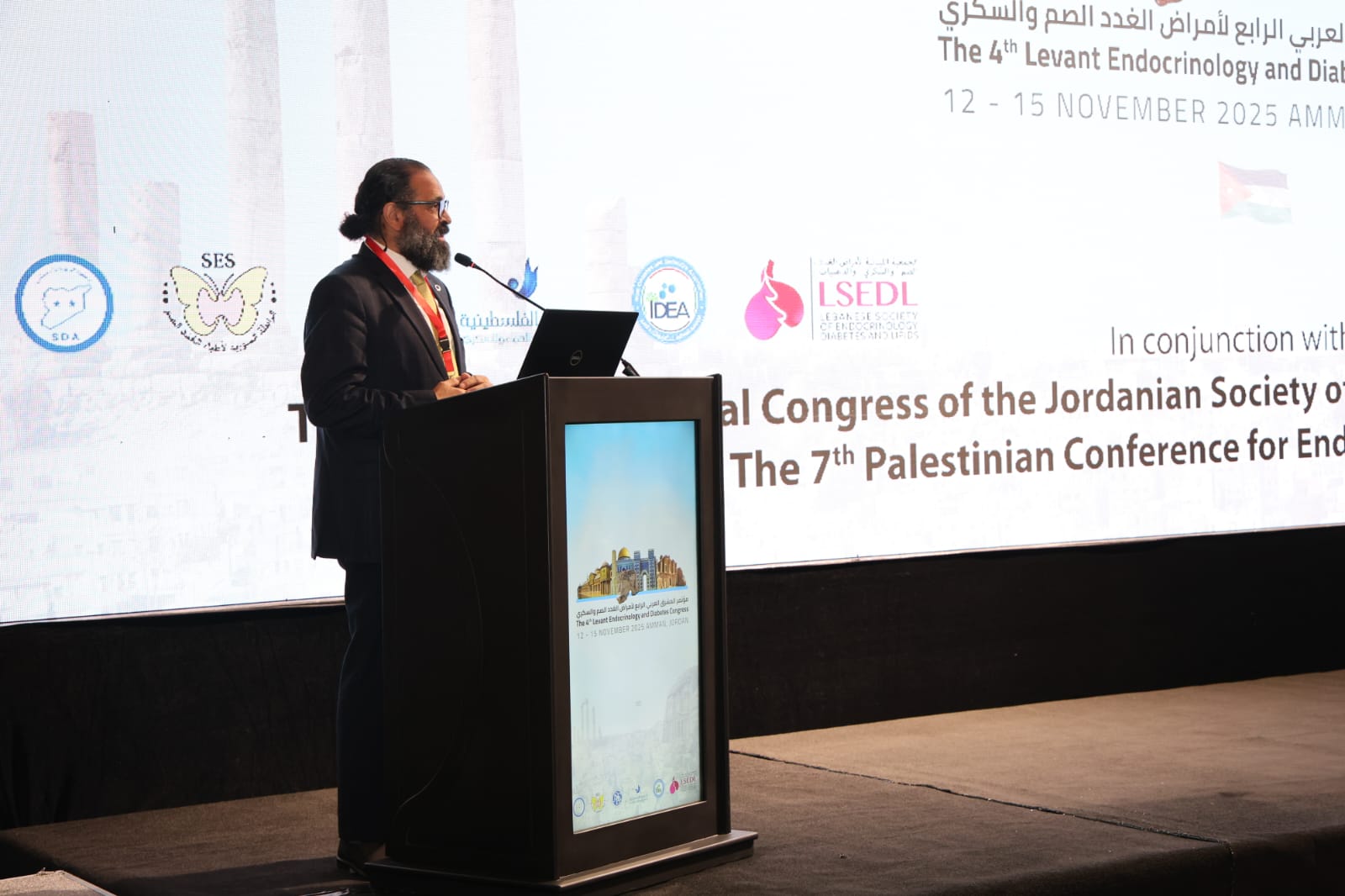 وأشار إلى هدف الجمعية في الارتقاء بالممارسة الطبية والبحث العلمي في مجال الغدد الصم والسكري وأمراض الاستقلاب. وأشاد بالتعاون المستمر بين الجمعية الأردنية والجمعية الفلسطينية والذي يجسد وحدة الهدف، ويؤكد رسالتنا الطبية والعلمية. ورحب بالمشاركين من الجمعيات العربية المشاركة من لبنان وسوريا والعراق وكردستان، مشيرًا إلى أن هذا الحدث العلمي الكبير هو ثمرة جهد جماعي استمر أكثر من عام من العمل المتواصل، بذلت فيه اللجان العلمية والتنظيمية تفانيها وإخلاصها. وشكر وزارة الصحة على دعمها المتواصل لمسيرة الطب والعلم، كما شكر شركات ومستودعات الأدوية المشاركة في المعرض المقام على هامش المؤتمر.