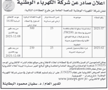 عطاءات صادرة عن شركة الكهرباء الوطنية
