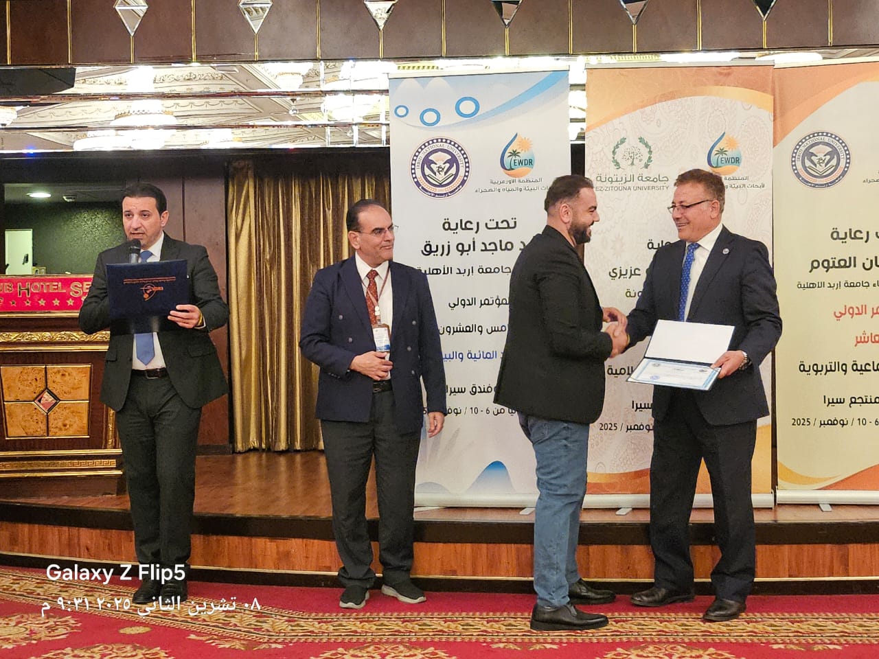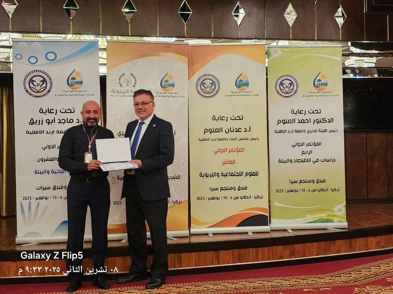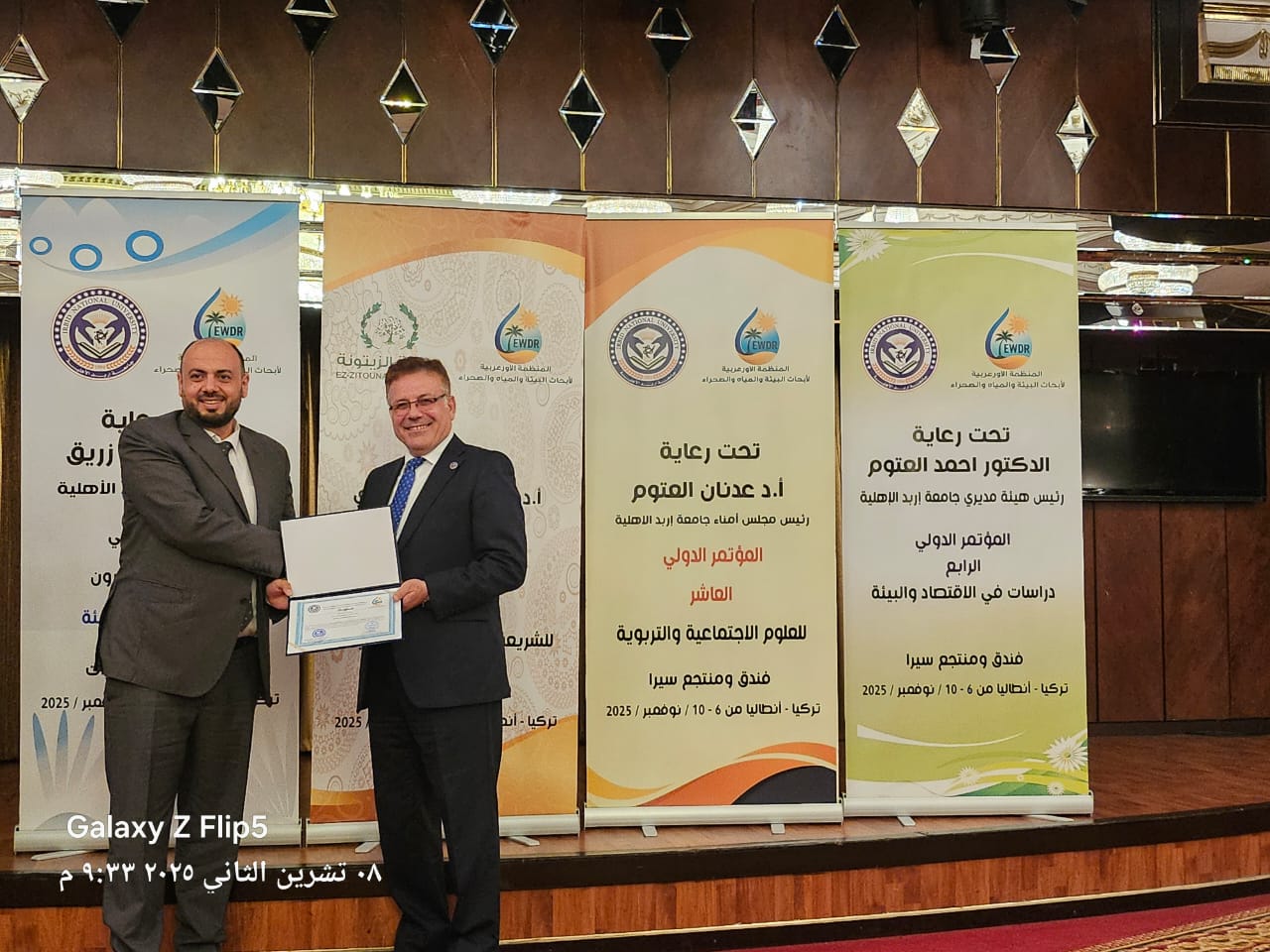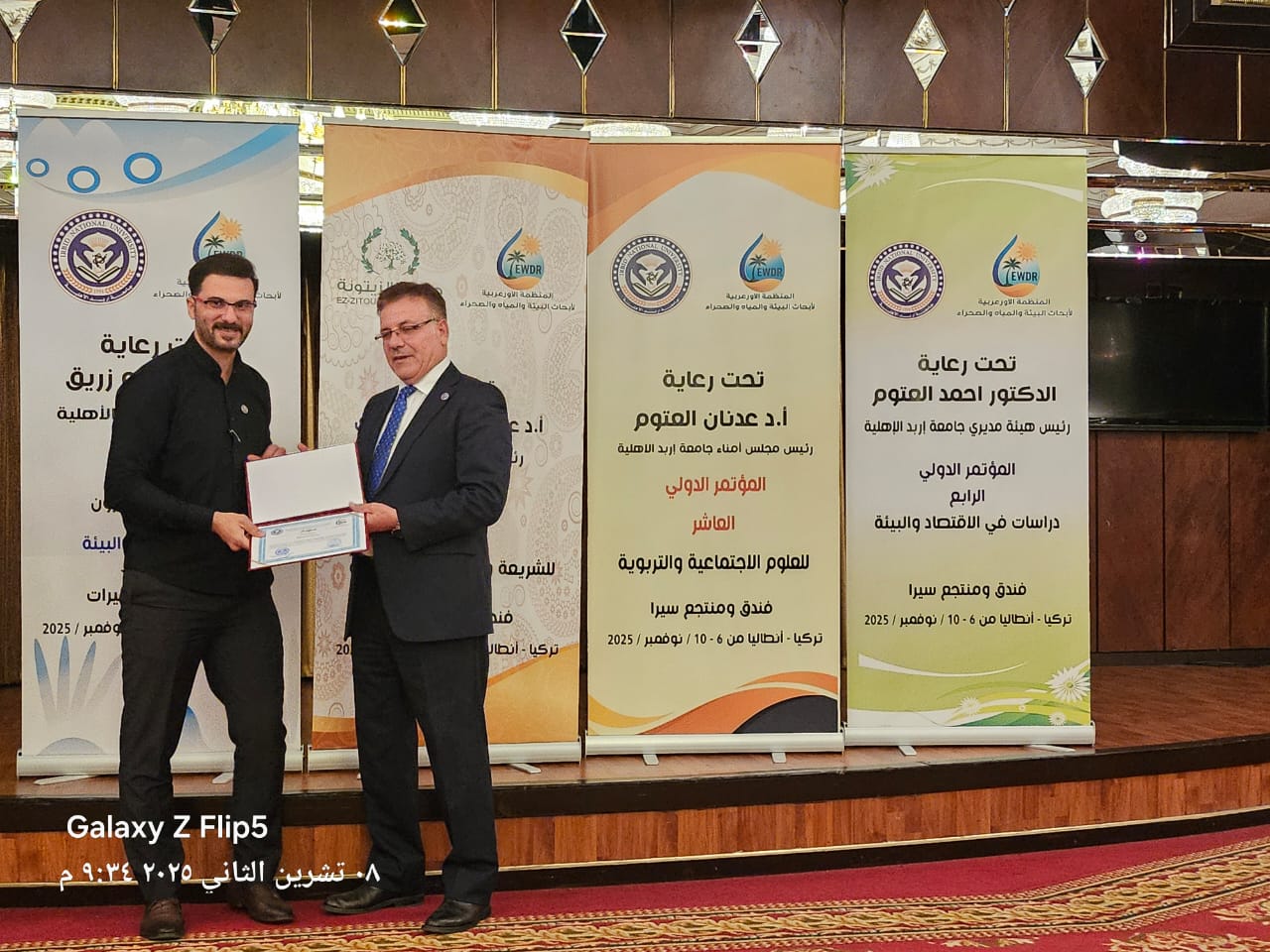 عمون - بحضور عربي ودولي وبمشاركة اكثر من 210 باحثين ، انتهت أعمال المنتدى الدولي التاسع عشر للبحث العلمي، والذي تقيمه المنظمة الأوروعربية لأبحاث البيئة والمياه والصحراء، في منتجع سيرا- أنطاليا/ تركيا، والذي خلاله رعى الأستاذ الدكتور عدنان العتوم/ رئيس مجلس أمناء جامعة إربد الأهلية، أعمال المؤتمر الدولي العاشر تحت عنوان (العلوم الاجتماعية والتربوية في عصر الذكاء الاصطناعي: تحديات الحاضر وآفاق المستقبل)، ورعى الأستاذ الدكتور ماجد أبو زريق/ رئيس جامعة إربد الأهلية، المؤتمر العلمي الدولي الرابع تحت عنوان: (دراسات في الاقتصاد والبيئة، رؤى وتطبيق)، وأعمال المؤتمر العلمي الدولي السابع، تحت عنوان: (الاتجاهات الحديثة في صناعة السياحة والآثار، الواقع والتحديات)، ورعى أعمال المؤتمر الدولي الأول بعنوان: (التكنولوجيات الناشئة والابتكارات في العلوم وتكنلوجيا المعلومات (ETISIT )، وبالتزامن مع هذه المؤتمرات وبنفس المكان فقد تم عقد المؤتمر الدولي الخامس والعشرون للموارد المائية والبيئة تحديات الحاضر وأفاق المستقبل، برعاية الأستاذ الدكتور عبد الملك آل شيخ/ أمين عام جائزة الأمير سلطان بن عبد العزيز العالمية للمياه، ، ورئيس المؤتمر الأستاذ الدكتور ماجد أبو زريق/ رئيس جامعة إربد الأهلية، والمؤتمر الدولي التاسع للشريعة والدراسات الإسلامية، برعاية الأستاذ الدكتور عبد اللطيف بو عزيزي/ رئيس جامعة الزيتونة في تونس الخضراء، وذلك بحضور الرئيس الشرفي للمنتدى الدكتور أحمد العتوم/ رئيس هيئة مديري جامعة إربد الأهلية، وعدد من عمداء الكليات، وأعضاء الهيئتين التدريسية والإدارية في الجامعة، وعطوفة الدكتور لطفي المومني/ أمين عام "المنظمة الأورو-عربية لأبحاث البيئة والمياه والصحراء".