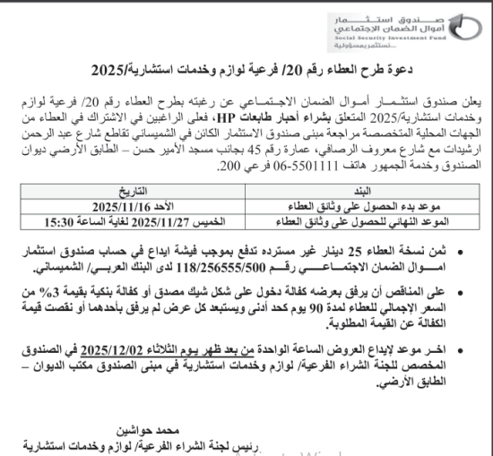 عطاء صادر عن صندوق استثمار اموال الضمان الاجتماعي
