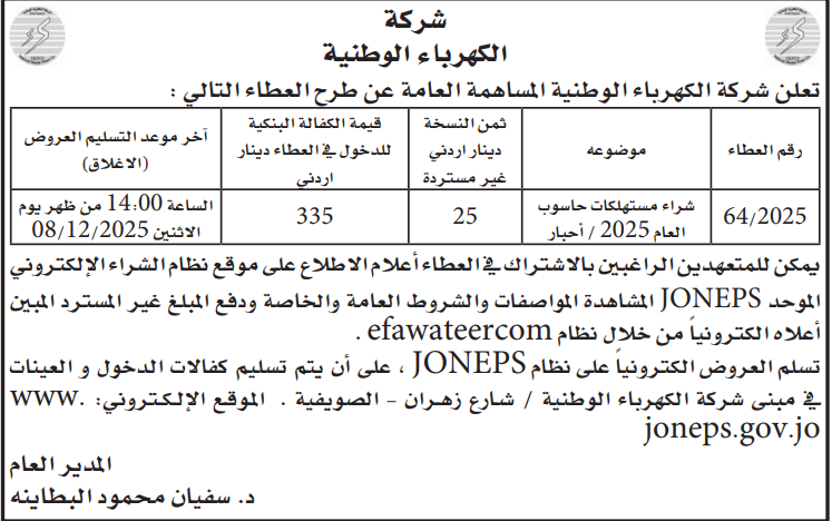 عطاء صادر عن شركة الكهرباء الوطنية