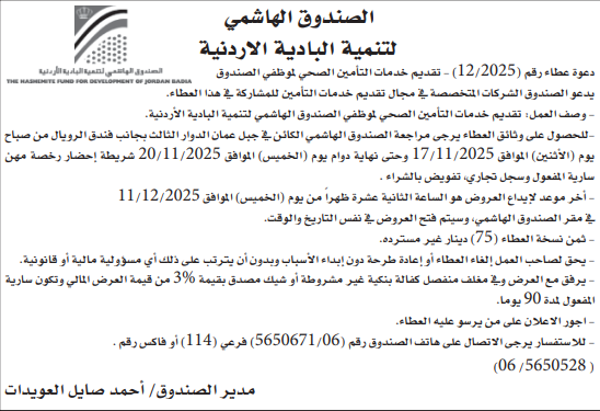 عطاء تقديم خدمات التأمين الصحي لموظفي الصندوق الهاشمي لتنمية البادية