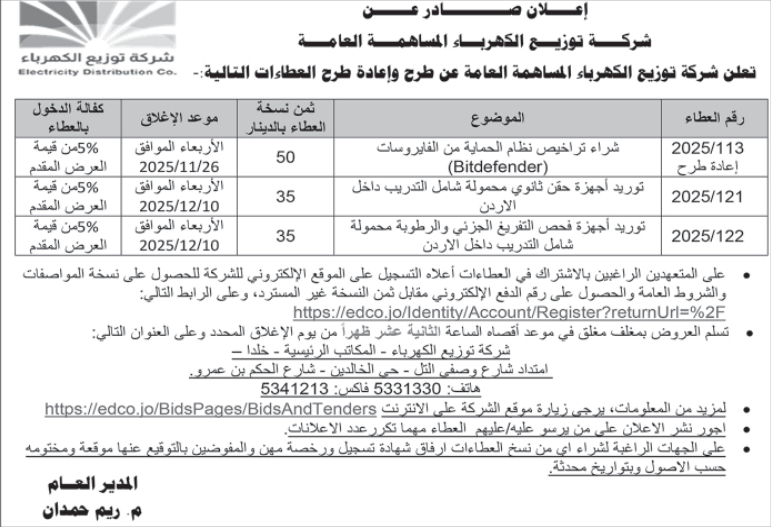 عطاءات صادرة عن شركة توزيع الكهرباء