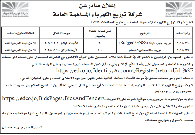 عطاءات صادرة عن شركة توزيع الكهرباء