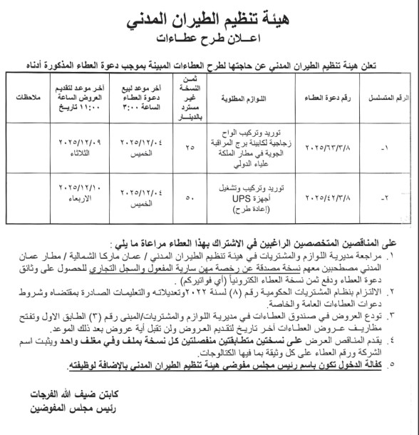 عطاءات صادرة عن هيئة تنظيم الطيران المدني