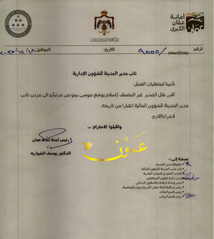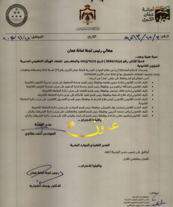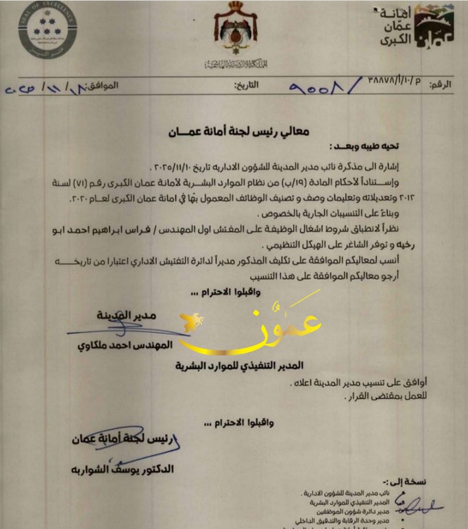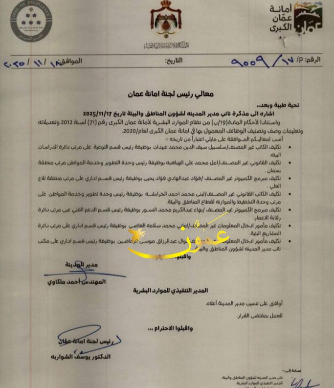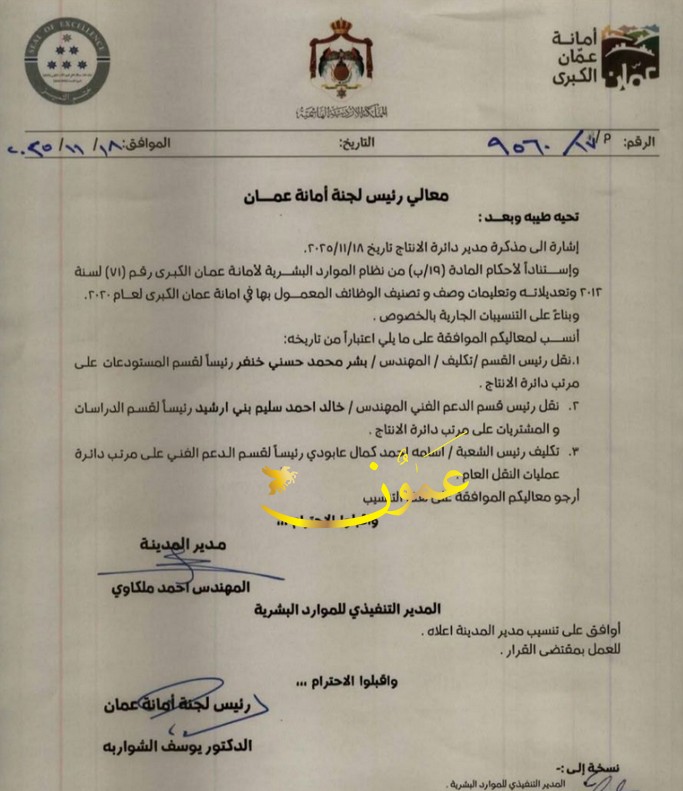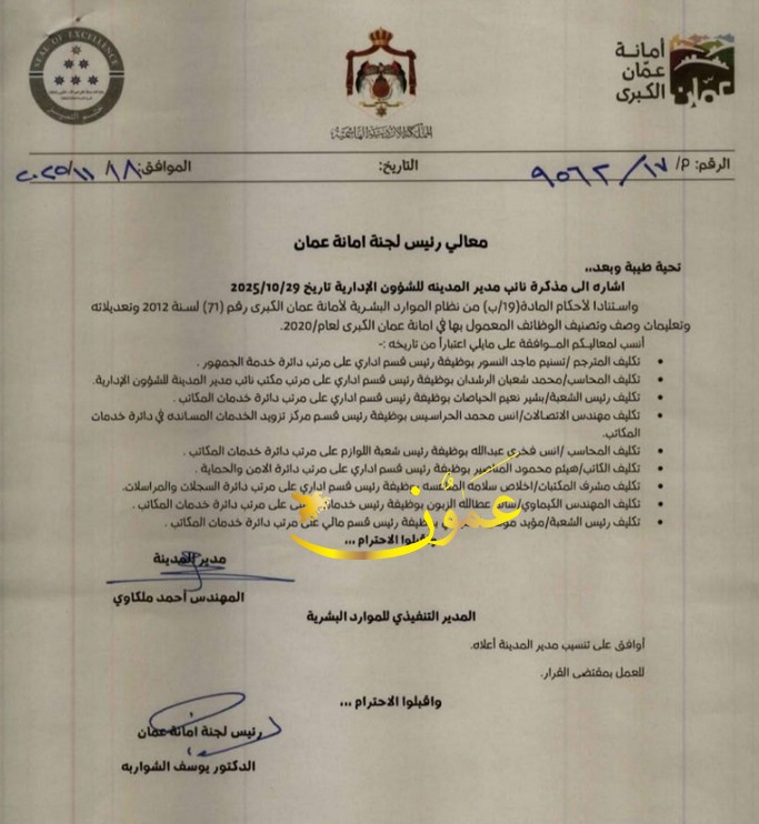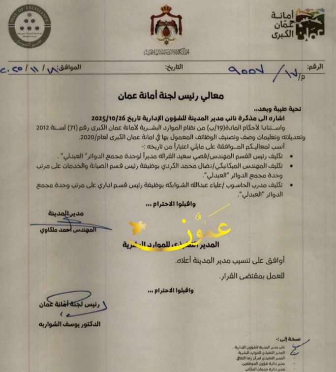 تنقلات تشمل رؤساء أقسام في أمانة عمان الكبرى (أسماء)