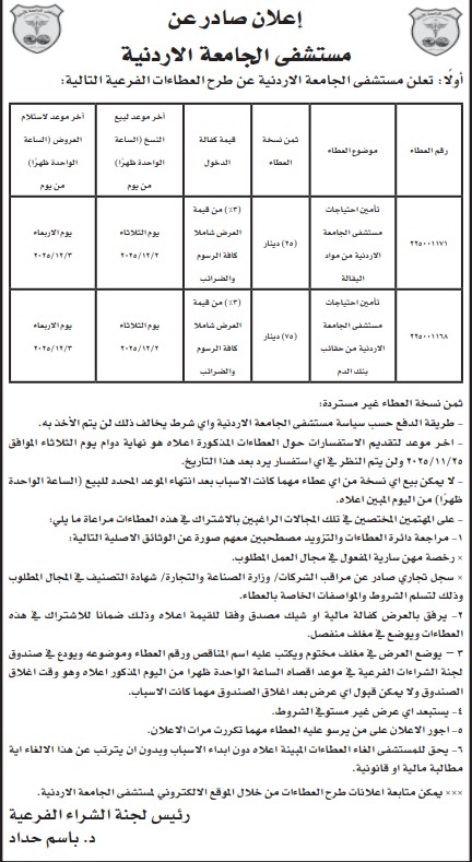 عطاءات صادرة عن مستشفى الجامعة الاردنية