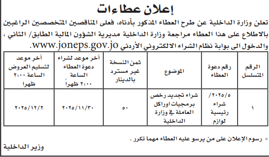 عطاء شراء تجديد رخص اروراكل لوزارة الداخلية