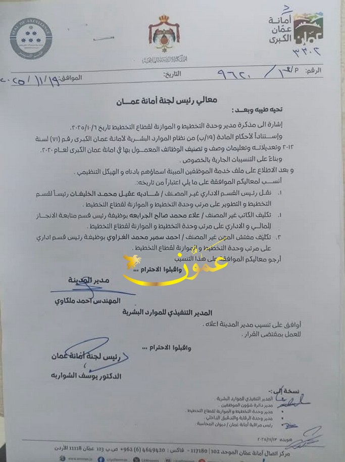 عمون - وافق رئيس لجنة أمانة عمان الكبرى الدكتور يوسف الشواربة على تنسيب مدير المدينة المهندس احمد ملكاوي، المتضمن نقل رئيس قسم غير إداري، وتكليف كاتب بوظيفة رئس قسم متابعة الإنجاز. |