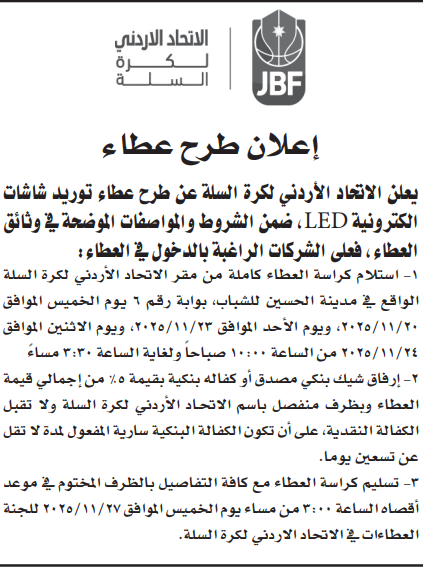 عطاء توريد شاشات الكتروني "LED"للاتحاد الاردني لكرة السلة
