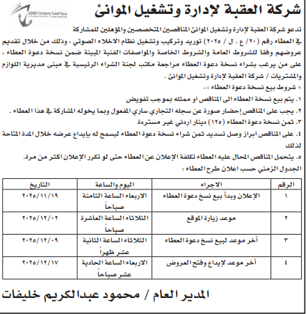عطاء صادر عن شركة العقبة لادارة وتشغيل الموانئ