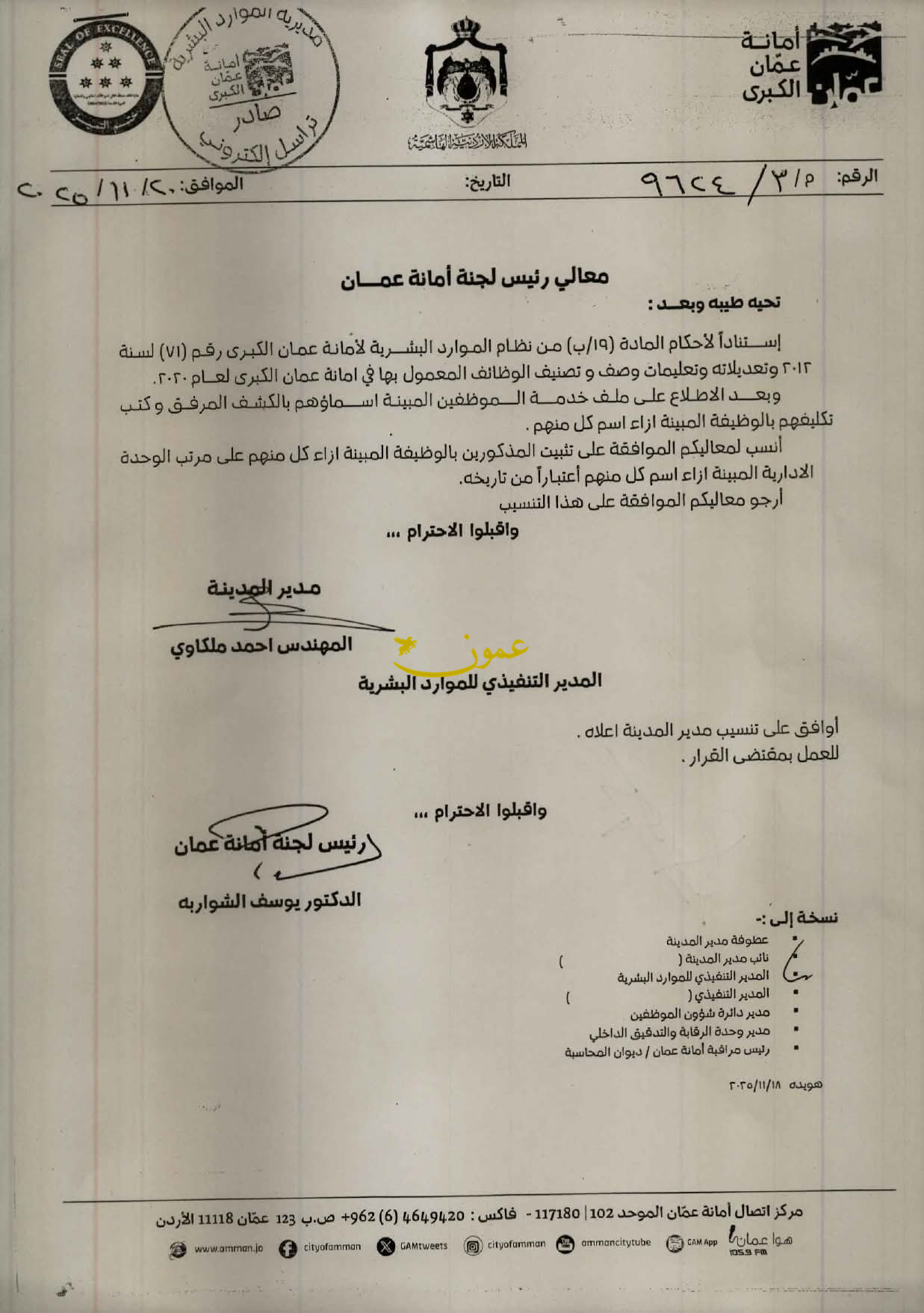 عمون - وافق رئيس لجنة أمانة عمان الكبرى الدكتور يوسف الشواربة، على تنسيب مدير المدينة، تثبيت موظفين في وحدهم الإدارية.