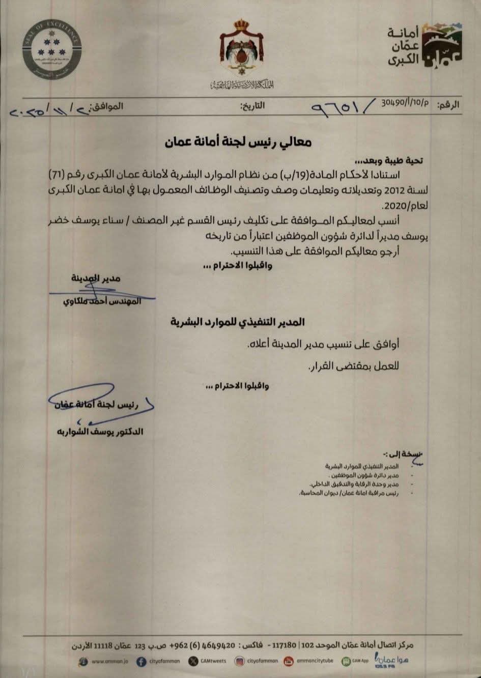 عمون - وافق رئيس لجنة أمانة عمان الكبرى الدكتور يوسف الشواربة، على تنسيب مدير المدينة بتكليف سناء يوسف خضر يوسف مديرة لدائرة شؤون الموظفين.