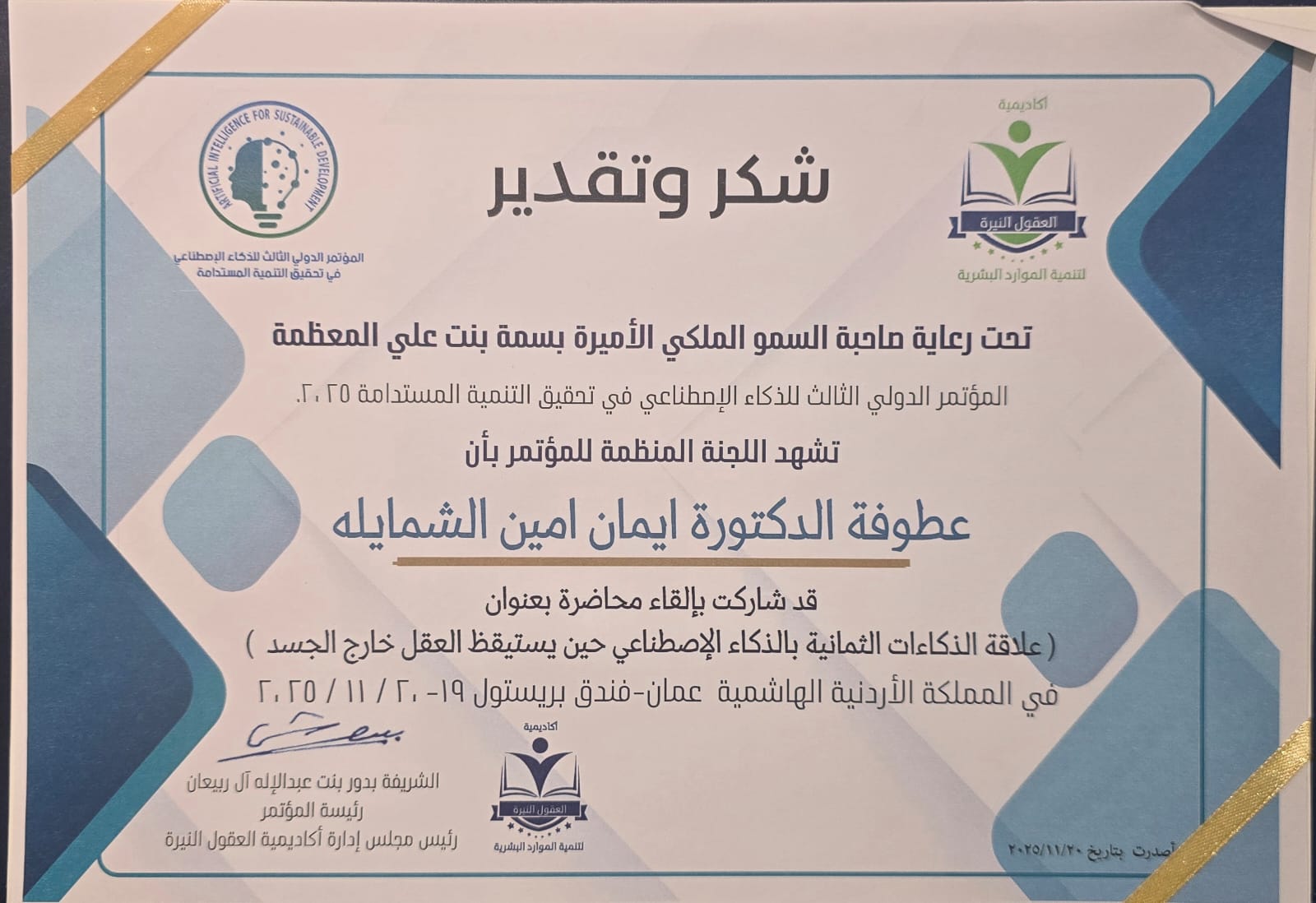 كَمَا نثمن بِكُلِّ التَّقْدِيرِ وَالِاحْتِرَامِ الْجُهُودَ الرِّيَادِيَّةَ الَّتِي تَبْذُلُهَا أَكَادِيمِيَّةُ الْعُقُولِ النَّيِّرَةِ بِرِئَاسَةِ سِيَادَةِ الشَّرِيفَةِ بُدُورِ بِنْتِ عَبْدِ الْإِلَهِ الْمُحْتَرَمَةِ، الَّتِي اسْتَطَاعَتْ أَنْ تُوَاصِلَ بِنَجَاحٍ تَنْظِيمَ مُؤْتَمَرِ الذَّكَاءِ الِاصْطِنَاعِيِّ الدُّوَلِيِّ لِلْعَامِ الثَّالِثِ عَلَى التَّوَالِي، مُسْتَقْطِبَةً الْعُلَمَاءَ وَالْمُفَكِّرِينَ مِنْ مُخْتَلَفِ أَنْحَاءِ الْعَالَمِ، لِتَظَلَّ الْأَكَادِيمِيَّةُ مَنَارَةً لِلْمَعْرِفَةِ، وَجِسْرًا يَصِلُ بَيْنَ الْفِكْرِ وَالْإِبْدَاعِ فِي خِدْمَةِ الْإِنْسَانِ وَالْمُسْتَقْبَلِ.