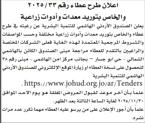 عطاء شراء معدات زراعية للصندوق الاردني الهاشمي للتنمية البشرية